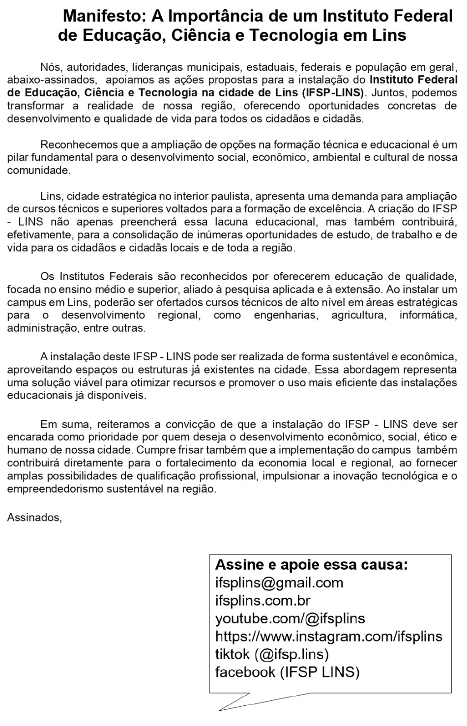 Apoie a implantação do IFSP-LINS e ajude a transformar nossa cidade em um polo