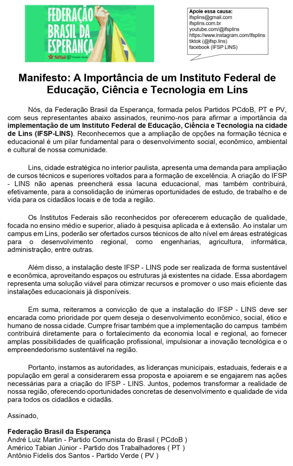 MANIFESTO: A IMPORTÂNCIA DE UM INSTITUTO FEDERAL DE EDUCAÇÃO, CIÊNCIA E